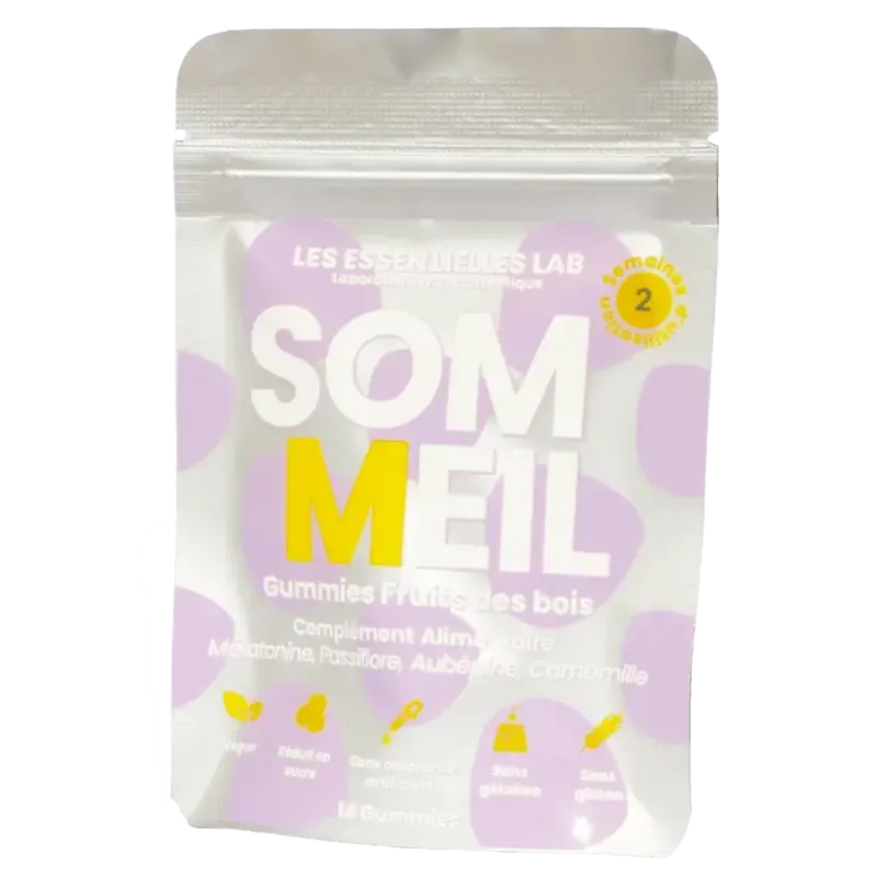 LES ESSENTIELLES LAB SOMMEIL GUMMIES FRUITS DE BOIS est un complément alimentaire sous forme de gommes à mâcher, conçu pour améliorer l'endormissement et la qualité du sommeil. Ce format découverte de 14 gummies est idéal pour tester l'efficacité du produit. Sa formule naturelle combine des extraits de plantes reconnues pour leurs vertus relaxantes, comme la mélatonine ou la mélisse, avec d'autres actifs bénéfiques pour le sommeil. Ce format ludique et savoureux est un allié pratique pour retrouver des nuits calmes et réparatrices, sans les contraintes de la prise de gélules.