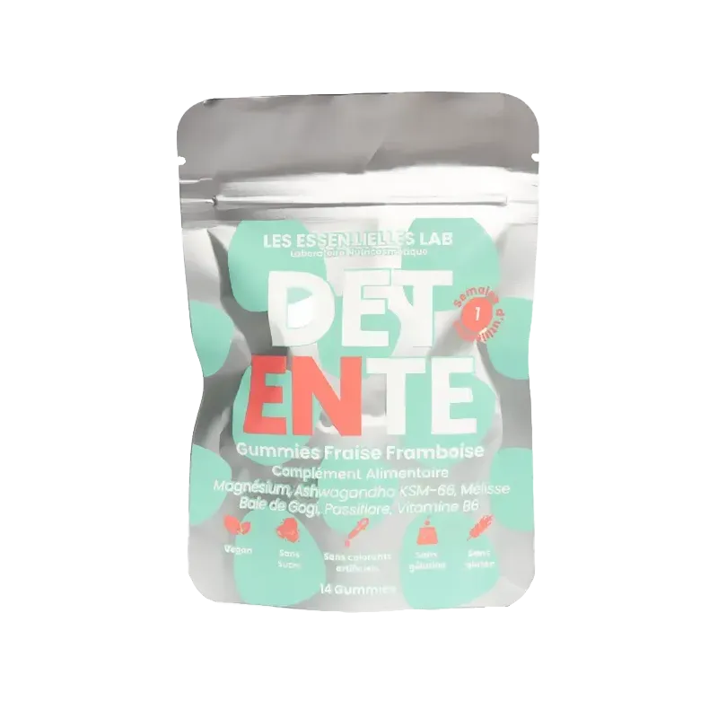 LES ESSENTIELLES LAB DÉTENTE 14 GUMMIES est un complément alimentaire sous forme de gommes à mâcher, conçu pour aider à la gestion du stress, de la nervosité et de l'anxiété. Ce format de 14 gummies est idéal pour une cure courte ou pour découvrir le produit. Sa formule naturelle combine des extraits de plantes reconnues pour leurs vertus relaxantes, comme la mélisse ou la camomille, avec des vitamines essentielles pour le bien-être mental. Ce format ludique et savoureux est un allié pratique pour se détendre au quotidien, sans les contraintes de la prise de gélules.