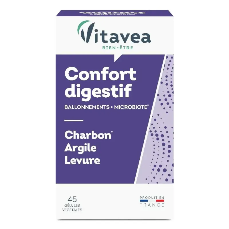 VITAVEA CONFORT DIGESTIF 45 GÉLULES est un complément alimentaire formulé pour apaiser les sensations de lourdeur, de ballonnements et de digestion difficile. Sa formule naturelle est une synergie d'extraits de plantes (comme l'Artichaut, le Fenouil et la Mélisse) qui agissent sur la digestion pour un meilleur confort après les repas. Ce produit est un allié précieux pour ceux qui souffrent régulièrement de troubles digestifs et qui souhaitent retrouver une sensation de légèreté.
