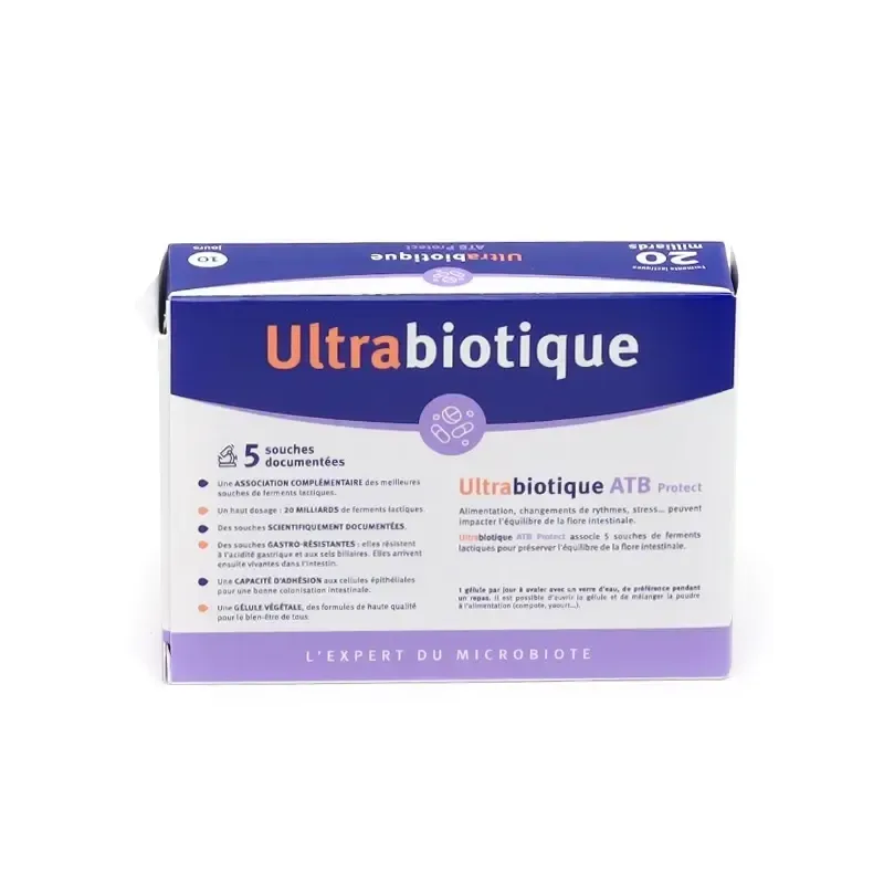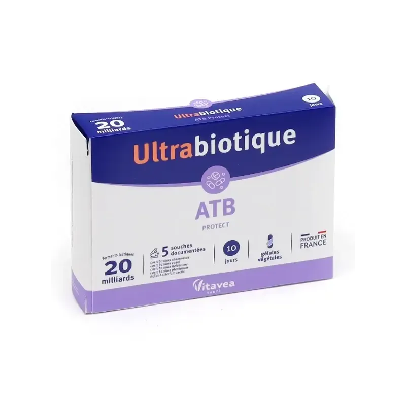 VITAVEA ULTRABIOTIQUE ATB PROTECT 10 GÉLULES est un complément alimentaire de la marque VITAVEA, spécifiquement formulé pour protéger et restaurer la flore intestinale durant et après un traitement aux antibiotiques. Les antibiotiques, tout en ciblant les bactéries pathogènes, peuvent aussi déséquilibrer le microbiote intestinal. Ce produit est une synergie de ferments lactiques (probiotiques) rigoureusement sélectionnés et d'actifs qui aident à maintenir l'équilibre intestinal et à réduire les effets secondaires digestifs des antibiotiques, comme la diarrhée.