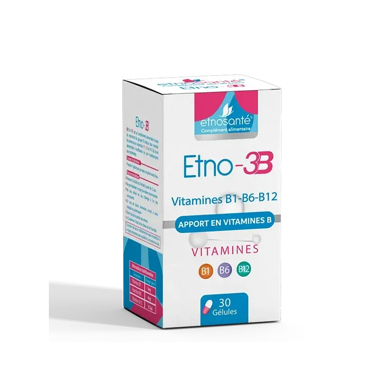 ETNO-3B d'Etnosanté est un complément alimentaire formulé pour combler les carences en vitamines du groupe B, essentielles au bon fonctionnement de l'organisme. Chaque gélule est conçue pour apporter une combinaison équilibrée de ces vitamines (B1, B2, B3, B5, B6, B8, B9 et B12) qui jouent un rôle crucial dans le métabolisme énergétique, le système nerveux et la réduction de la fatigue. Ce complément est idéal pour les personnes fatiguées, stressées ou ayant des besoins accrus en vitamines B, comme les sportifs ou les personnes âgées.