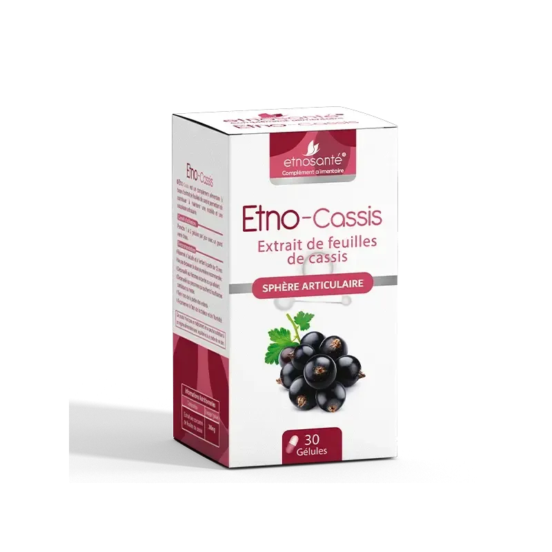 ETNO CASSIS d'Etnosanté est un complément alimentaire formulé à base d'un extrait concentré de feuilles de cassis (Ribes nigrum). Le cassis est traditionnellement reconnu pour ses propriétés anti-inflammatoires et ses vertus sur le confort articulaire et urinaire. Ce complément est conçu pour aider à soulager les douleurs articulaires, réduire les raideurs et les gonflements, et soutenir les fonctions d'élimination de l'organisme.