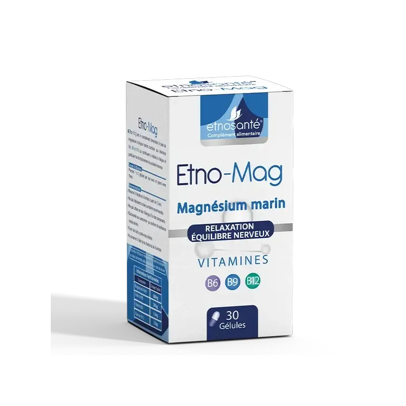 ETNO MAG d'Etnosanté est un complément alimentaire conçu pour favoriser la relaxation et l'équilibre du système nerveux. Sa formule synergique combine du Magnésium marin et des extraits de plantes comme la Mélisse et la Valériane. Le magnésium est un minéral essentiel qui contribue au bon fonctionnement du système nerveux et à la réduction de la fatigue, tandis que la Mélisse et la Valériane sont reconnues pour leurs propriétés apaisantes et relaxantes. Ce complément est idéal pour les personnes soumises au stress, à la fatigue nerveuse ou qui ont des difficultés à se détendre.
