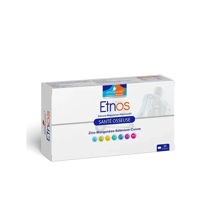 ETNO SANTE OSSEUSE d'Etnosanté est un complément alimentaire formulé pour le maintien d'une ossature normale. Sa composition unique combine des nutriments essentiels comme le Calcium, la Vitamine D3, et d'autres actifs synergiques qui agissent pour fortifier les os et les dents. Il est idéal pour les personnes souhaitant préserver leur capital osseux à long terme, notamment en période de croissance, pendant la ménopause, ou chez les personnes âgées.