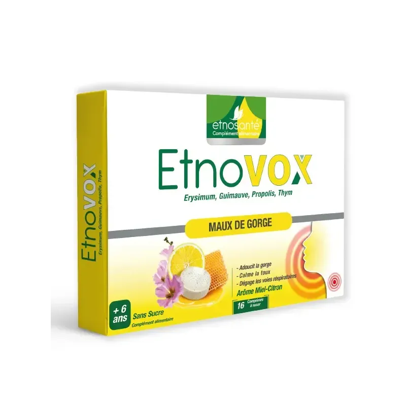 ETNOVOX Maux de Gorge d'Etnosanté est un complément alimentaire sous forme de comprimés à sucer, formulé pour apaiser et adoucir la gorge irritée. Sa composition associe des ingrédients naturels reconnus pour leurs propriétés apaisantes et antiseptiques, notamment le Miel et le Thym. Les comprimés libèrent progressivement leurs actifs au contact de la salive, procurant un soulagement immédiat et durable des sensations de picotement, de brûlure et de douleur. Le goût agréable de miel et de citron rend la prise plaisante.