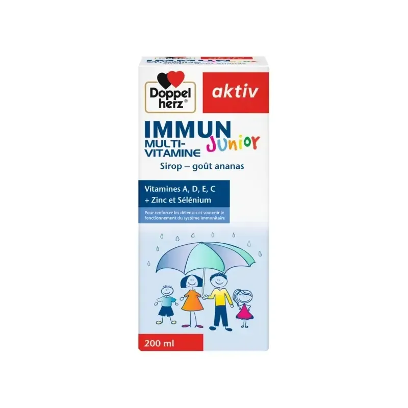 AKTIV IMMUN JUNIOR est un sirop spécialement formulé pour les enfants et adolescents afin de soutenir et renforcer leur système immunitaire. Sa formule complète associe des vitamines (A, C, D, E, B6, B12), des minéraux (Zinc, Sélénium) et d'autres nutriments essentiels. Ces actifs agissent en synergie pour aider le corps à se défendre contre les infections, surtout durant les périodes de froid, de fatigue ou de changements de saison. Son goût fruité et sa texture liquide le rendent facile à prendre pour les plus jeunes.
