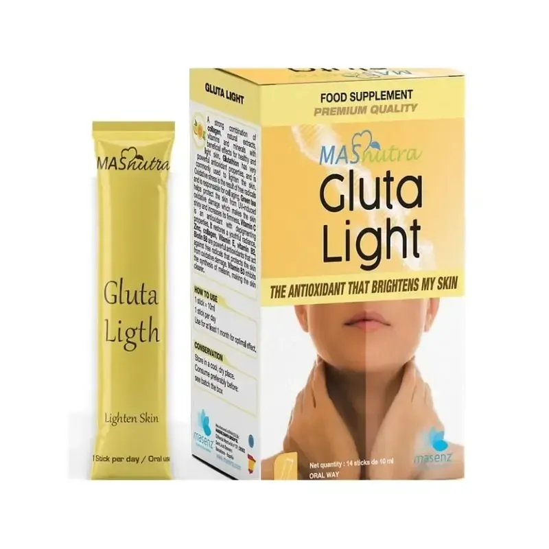GLUTA LIGHT est un complément alimentaire sous forme de sticks buvables, formulé pour le bien-être de la peau et la protection de l'organisme. Sa composition unique associe le glutathion, un puissant antioxydant, à d'autres nutriments comme la vitamine C et la vitamine E. Le glutathion est une molécule naturellement présente dans le corps, qui joue un rôle crucial dans la détoxification et la lutte contre le stress oxydatif, un facteur de vieillissement cutané. Ce complément est idéal pour les personnes souhaitant retrouver un teint lumineux, unifier la pigmentation de la peau et protéger leurs cellules des agressions extérieures.