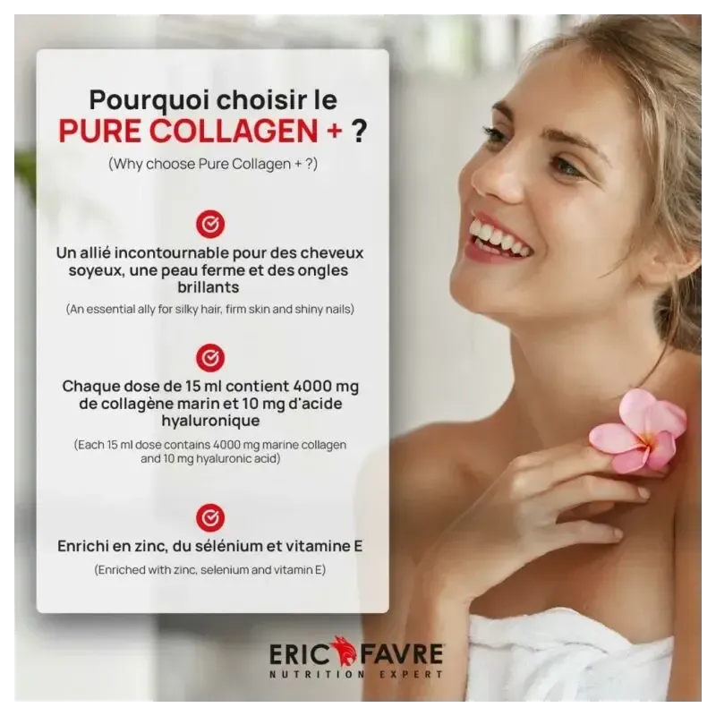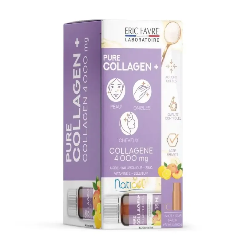 ERIC FAVRE PROGRAMME 10 JOURS PURE COLLAGEN+ est un complément alimentaire sous forme de flacons buvables, conçu pour agir de l'intérieur sur la santé et la beauté de la peau, des cheveux et des ongles. Ce programme intensif de 10 jours contient du collagène marin hydrolysé, une forme de collagène hautement biodisponible qui est facilement assimilée par le corps. Le collagène est la principale protéine structurelle de la peau, responsable de sa fermeté, de son élasticité et de son hydratation. Enrichie en vitamine C, la formule favorise la synthèse de collagène et offre une protection antioxydante. Ce programme est idéal pour un "coup d'éclat" rapide ou pour lutter contre les premiers signes du vieillissement.
