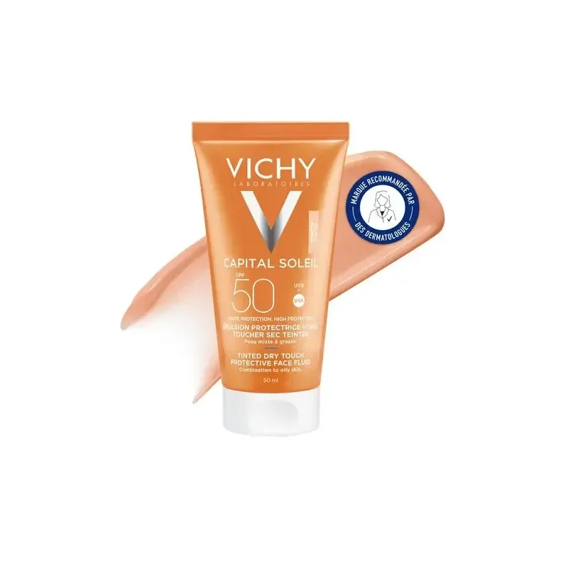 L'émulsion teintée toucher sec SPF50 Capital Soleil de Vichy est un soin solaire innovant conçu pour les peaux mixtes à grasses. Sa formule haute protection associe des filtres UVA/UVB à large spectre pour prévenir les dommages causés par le soleil, le vieillissement prématuré et l'apparition de taches pigmentaires. Sa texture légère, fondante et non grasse, enrichie en pigments minéraux, s'absorbe instantanément et laisse un fini mat et velouté. Elle unifie le teint et floute les imperfections pour un effet bonne mine immédiat, sans obstruer les pores ni laisser de sensation collante. Elle est également enrichie en eau thermale de Vichy aux propriétés apaisantes et fortifiantes.