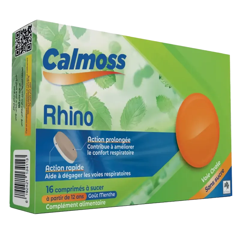VITAL CALMOSS RHINO est un complément alimentaire sous forme de comprimés à sucer, formulé pour apaiser la gorge irritée et les voies respiratoires. Il combine des extraits de plantes traditionnellement utilisées pour leurs propriétés adoucissantes et expectorantes, offrant un soulagement rapide et durable en cas de toux sèche ou grasse.