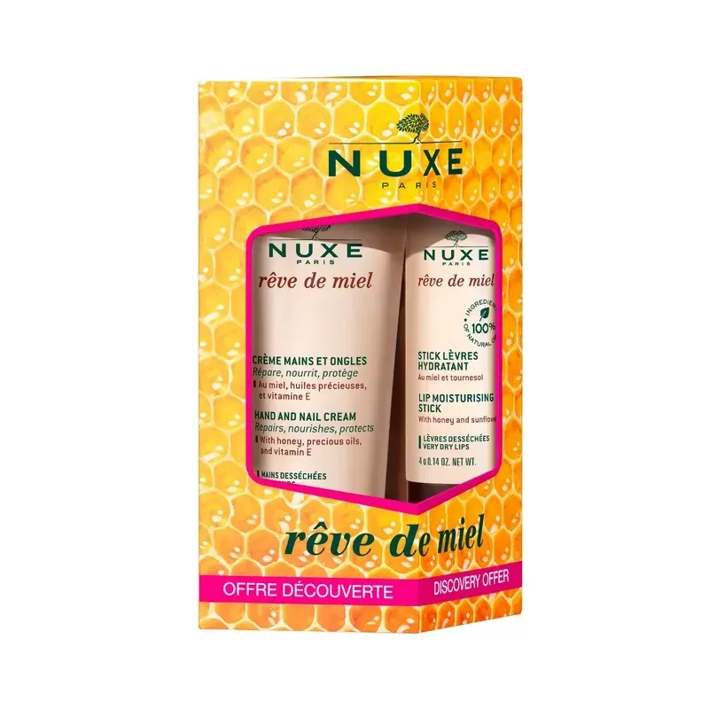 Le Duo Rêve de Miel incarne la philosophie de la gamme NUXE : des soins basés sur les bienfaits du miel et d'autres ingrédients naturels pour offrir une réparation intense. Le Stick Lèvres Hydratant Rêve de Miel est enrichi en huile de tournesol et en huile de macadamia, qui apportent une hydratation durable et un confort immédiat. La Crème Mains et Ongles Rêve de Miel, quant à elle, combine le miel réparateur avec des huiles végétales précieuses et de la vitamine E pour nourrir en profondeur et protéger la peau des mains. Le parfum gourmand et réconfortant de la gamme rend chaque application sensorielle et agréable.