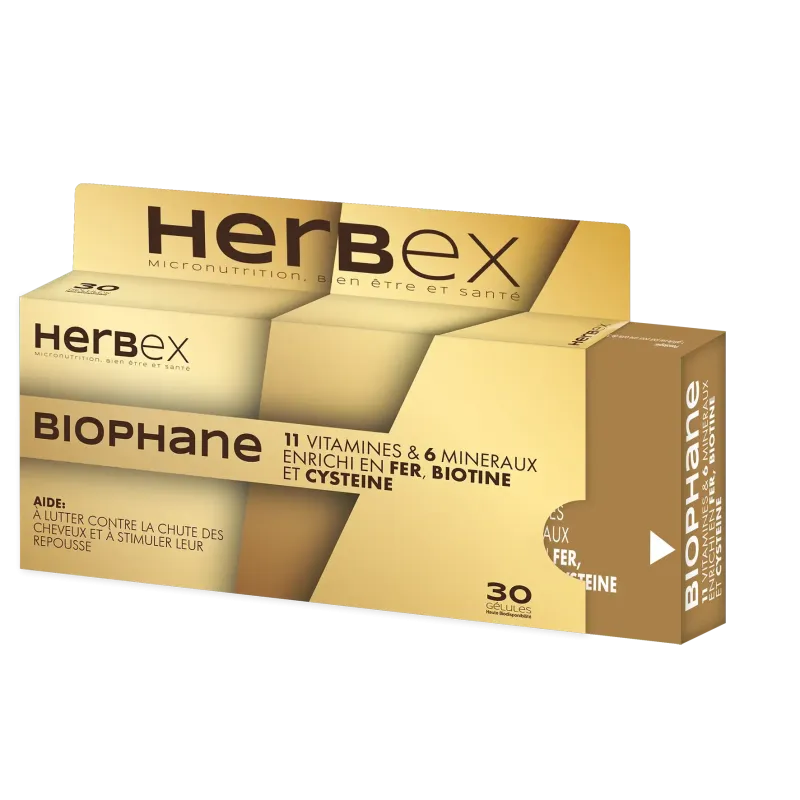 HERBEX BIOPHANE est un complément alimentaire conçu pour renforcer et sublimer les cheveux, la peau et les ongles. Sa formule unique, riche en Biotine (Vitamine B8), vitamines et minéraux, nourrit ces tissus de l'intérieur pour les rendre plus forts et plus résistants.