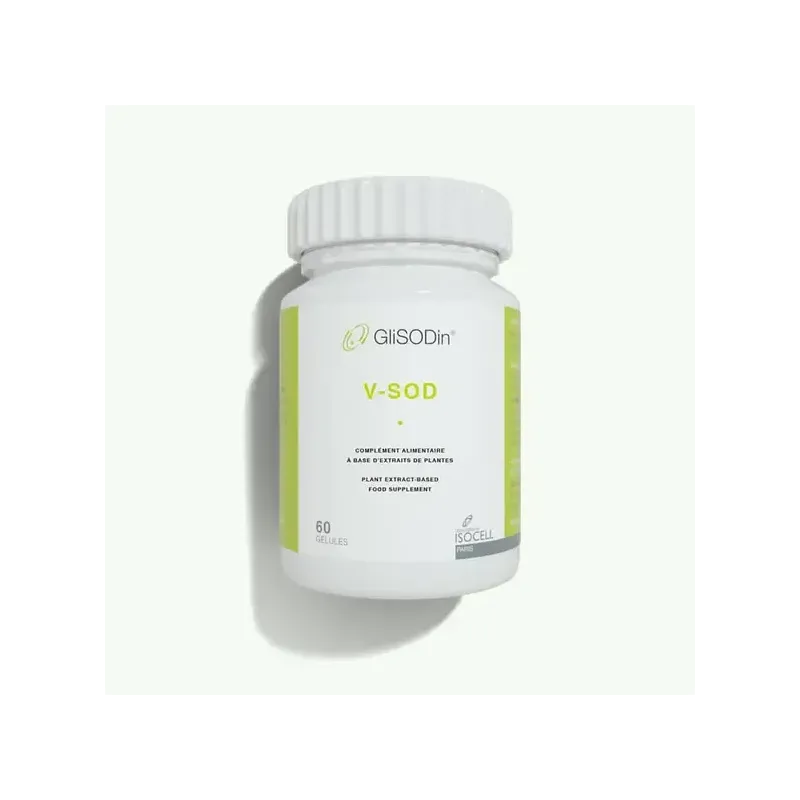 GLISODIN V-SOD est un complément alimentaire conçu pour offrir une protection antioxydante complète et renforcer les défenses naturelles de l'organisme. Sa formule unique, à base de Superoxyde Dismutase (SOD) de melon, aide à neutraliser les radicaux libres et à protéger les cellules contre le stress oxydatif.
