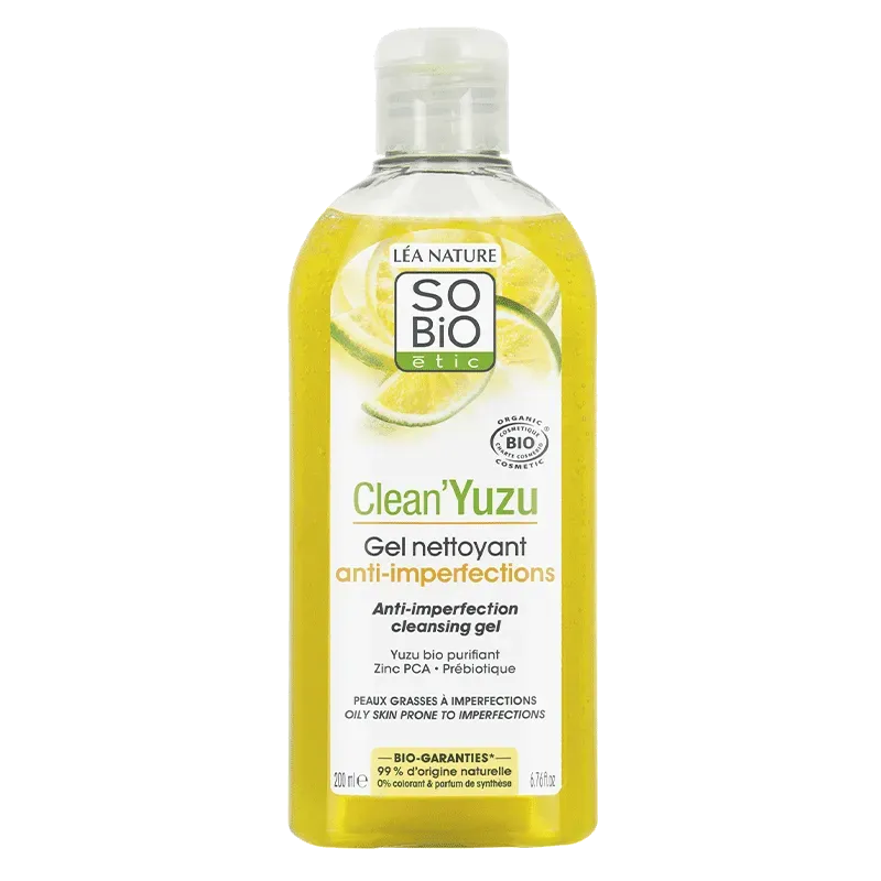 Le SO BIO CLEAN YUZU GEL NETTOYANT ANTI IMPERFECTIONS est un gel moussant purifiant de la gamme Clean'Yuzu de SO'BiO étic, spécialement formulé pour les peaux grasses à imperfections. Ce soin nettoyant certifié biologique travaille à purifier l'épiderme, à éliminer efficacement les impuretés, et à réguler l'excès de sébum. Il est enrichi d'une synergie d'actifs ciblés : le Yuzu bio, reconnu pour ses propriétés purifiantes, le Zinc PCA, qui aide à contrôler la production de sébum et possède un effet anti-bactérien, et un prébiotique rééquilibrant pour préserver la barrière cutanée. Ce gel aide à réduire visiblement les imperfections et les brillances pour une peau plus nette, fraîche et un grain de peau affiné. Son parfum agrume vitaminé est $100\%$ d'origine naturelle.
