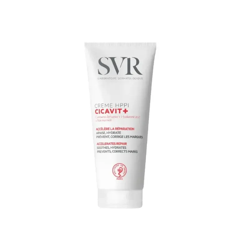 La crème réparatrice CICAVIT+ Crème HPPI de SVR est un soin intensif conçu pour réparer, apaiser et protéger les peaux abîmées et irritées de toute la famille. Sa formule, dotée de la technologie HPPI (Hydro-Protecting Polymer), accélère la réparation cutanée et réduit visiblement les rougeurs et les marques. Le complexe réparateur CICAVIT+, riche en micro-organismes et en sucre prébiotique, agit sur la restauration de la flore cutanée et stimule la cicatrisation naturelle. Sa texture fondante et non grasse forme un film protecteur invisible qui isole la peau des agressions extérieures. Elle apaise immédiatement les irritations, les démangeaisons et les sensations de tiraillement. Idéale pour les coupures, les écorchures, les irritations dues aux frottements, les rougeurs post-épilation, les coups de soleil ou les tatouages.