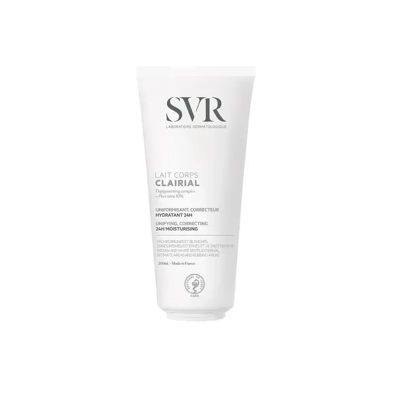Le lait de corps CLAIRIAL de SVR est un soin dépigmentant et hydratant, conçu pour corriger et prévenir l'apparition des taches brunes sur le corps, y compris sur les zones sensibles comme le cou et le décolleté. Sa formule, dotée du complexe Clairial et de la technologie Lumi-White, agit à plusieurs niveaux pour réduire visiblement les taches et unifier le teint. Il contient des actifs puissants qui inhibent la production de mélanine et favorisent l'exfoliation en douceur des cellules chargées de pigments. Sa texture fluide et légère pénètre rapidement, offrant une hydratation intense qui dure toute la journée. La peau est nourrie, douce et le teint devient plus homogène et lumineux.