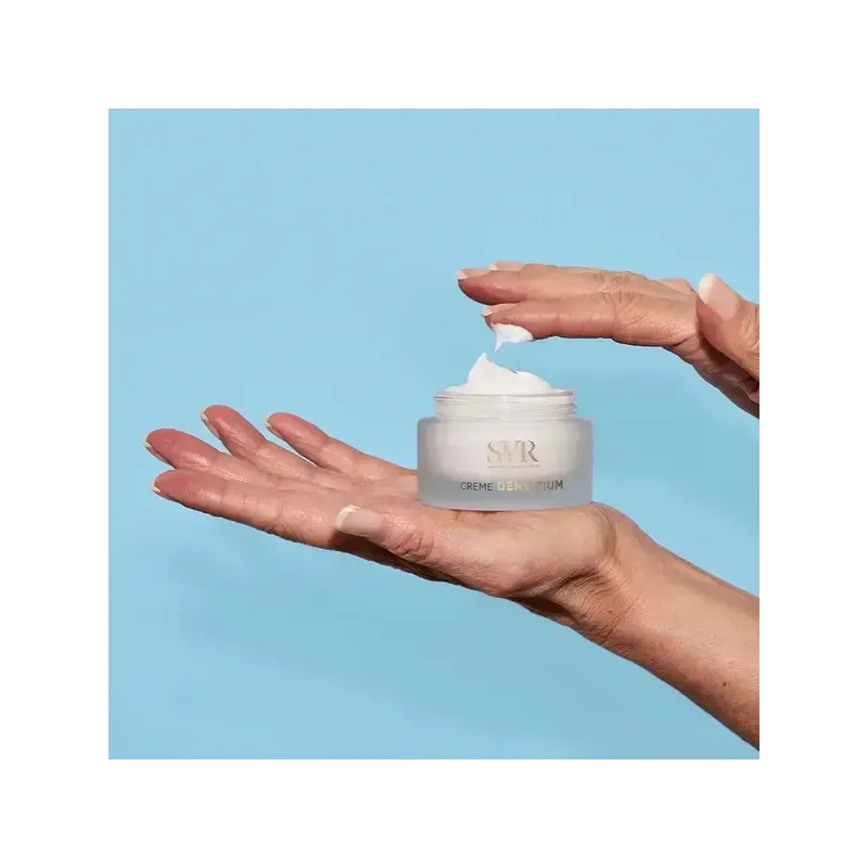 La crème DENSITIUM de SVR est un soin anti-âge global spécialement conçu pour les peaux matures qui présentent un manque de densité et un relâchement cutané. Sa formule, enrichie en actifs dermatologiques puissants, inclut du bio-calcium, un complexe minéral qui agit en profondeur pour restructurer et redensifier la peau et restaurer son élasticité. L'acide hyaluronique ultra-fragmenté hydrate et repulpe la peau, comblant les rides et ridules de l'intérieur. Sa texture onctueuse, soyeuse et fondante pénètre rapidement, offrant une sensation de bien-être immédiat. Jour après jour, la peau est visiblement plus ferme, plus dense et les rides sont lissées. Le contour du visage est redessiné, et la peau retrouve sa souplesse et son éclat.