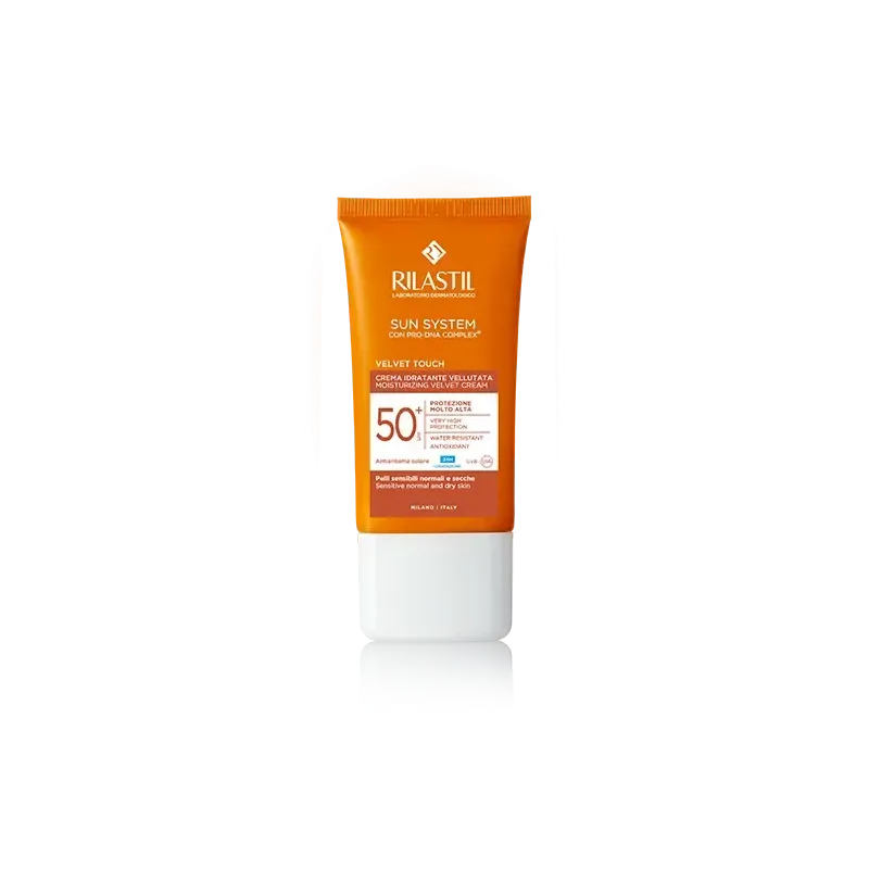 La crème RILASTIL SUN SYSTEM Velvet Touch SPF50+ est un écran solaire pour le visage, idéal pour les personnes qui recherchent une très haute protection solaire associée à un fini mat et velouté. Sa formule est une combinaison de filtres solaires photostables et efficaces, qui offrent une défense à large spectre contre les rayons UVA et UVB, prévenant ainsi les coups de soleil et le photovieillissement. Il est enrichi en Pro-Défense, un complexe antioxydant qui protège les cellules de la peau du stress oxydatif causé par les radicaux libres et la pollution. Le soin contient aussi des micro-particules matifiantes qui contrôlent l'excès de sébum et la brillance, pour un fini sec et soyeux qui dure toute la journée. Sa texture crème légère, non grasse et non collante, pénètre rapidement, ce qui la rend idéale comme base de maquillage. Elle est résistante à l'eau et à la sueur, ce qui en fait un allié parfait pour les activités de plein air.
