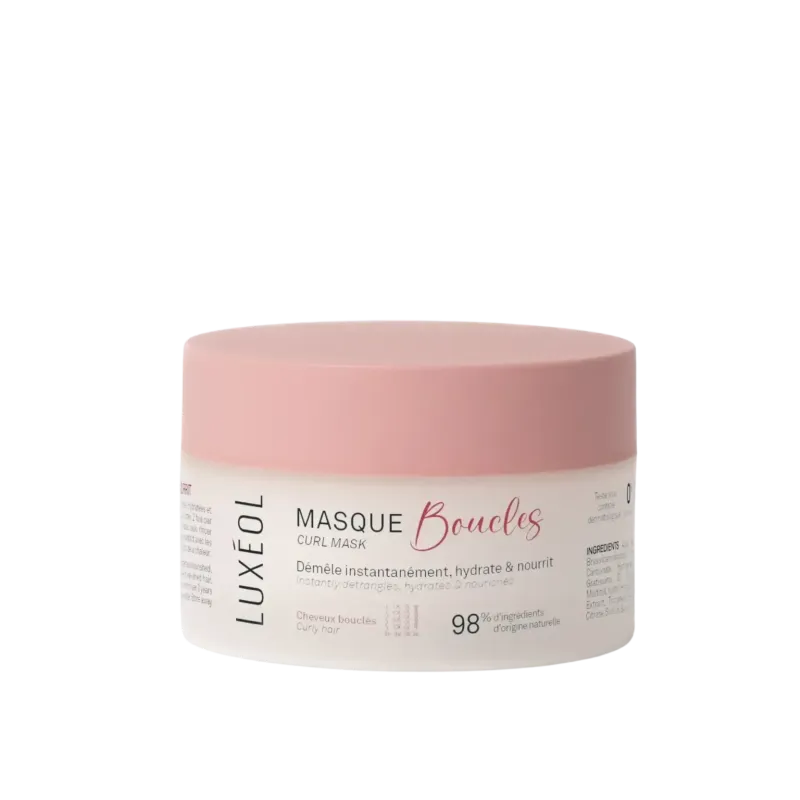Masque Luxéol de 200 ml, formulé avec 98 % d'ingrédients naturels, qui démêle, hydrate et nourrit en profondeur les cheveux bouclés (2C à 3C). Il restructure la fibre capillaire pour des boucles définies, rebondies et sans frisottis, à laisser poser 5 minutes.