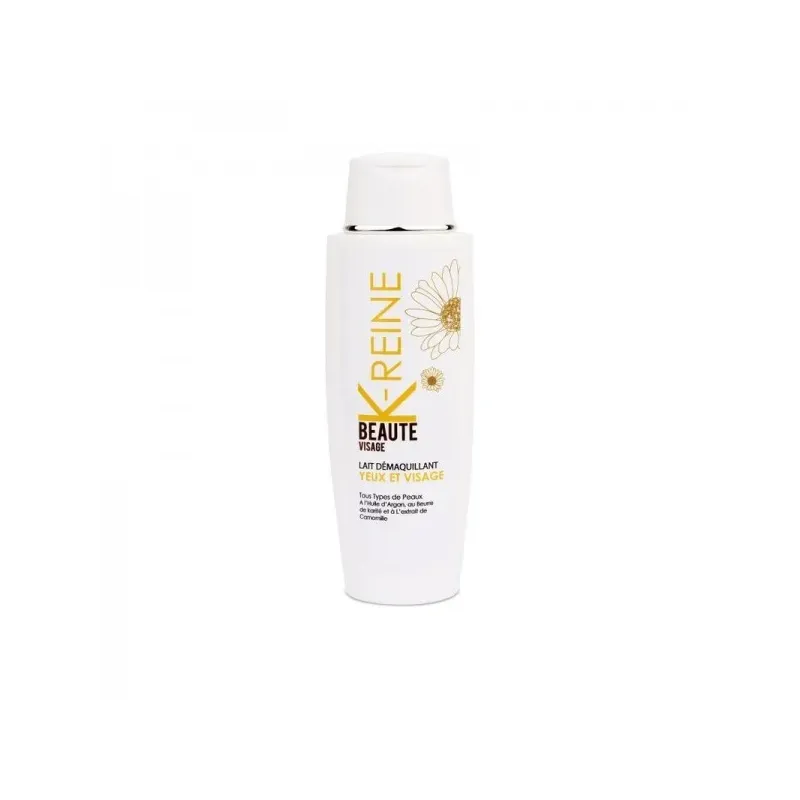 Lait démaquillant K-REINE 200ML pour yeux et visage, enrichi à l'huile d'argan, beurre de karité et camomille, élimine le maquillage et les impuretés en douceur, laissant la peau nette et douce.