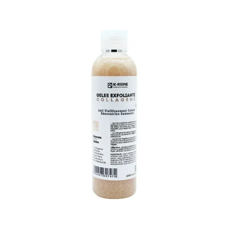 Gelée exfoliante K-REINE 250ML au Collagène et extraits de Mimosa/Calendula, gomme en douceur grâce aux microsphères, régénère, lisse la peau et ravive l'éclat du teint.