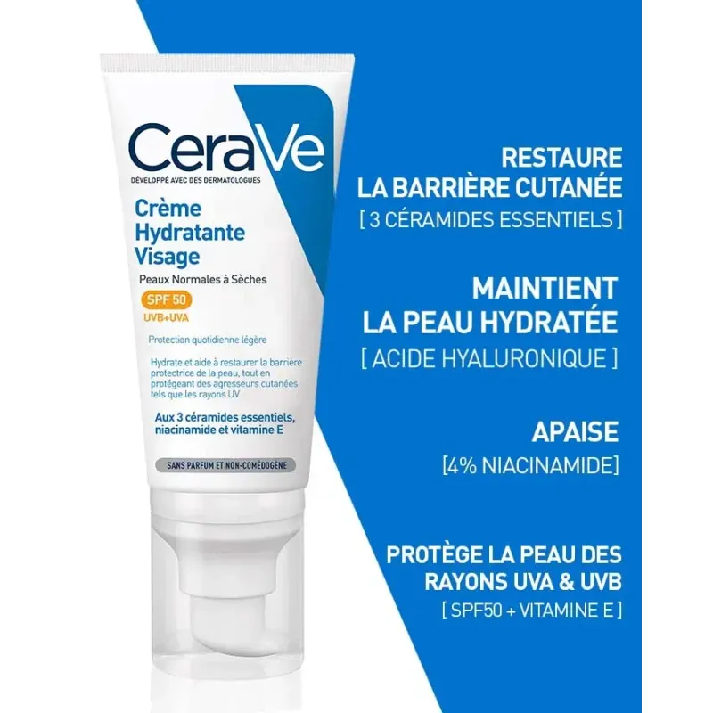 La crème de jour CeraVe hydrate en continu, protège le visage avec un très haut SPF50 et maintient une barrière cutanée saine grâce aux 3 céramides essentiels.