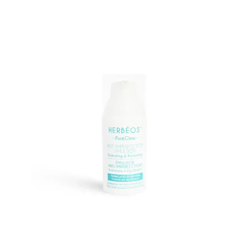 HERBEOS PURE GLOW ÉMULSION HYDRATANTE ANTI IMPERFECTIONS est un soin quotidien oil-free conçu pour hydrater les peaux mixtes à grasses et sujettes aux imperfections, sans provoquer de brillance. Sa formule légère et non comédogène apporte l'hydratation nécessaire tout en agissant activement pour équilibrer la production de sébum et réduire les imperfections existantes (boutons, points noirs). Elle travaille à la source du problème grâce à un complexe d'actifs purifiants et apaisants qui calment les rougeurs et aident à atténuer les marques post-acné. Rapidement absorbée, elle laisse un fini mat et confortable, faisant d'elle une excellente base de maquillage. Elle est le geste hydratant essentiel d'une routine anti-acné efficace.