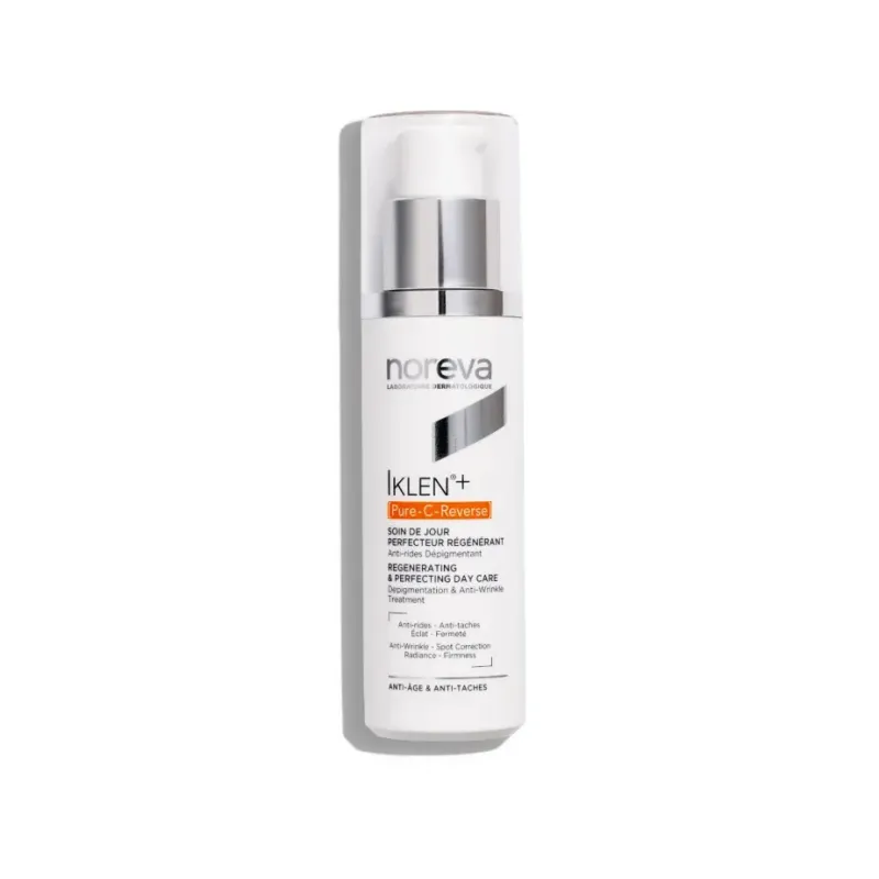 Le NOREVA IKLEN+ PURE-C-REVERSE Soin de Jour Perfecteur Régénérant est un traitement anti-âge global de haute technologie, inspiré de la médecine esthétique. Il est spécifiquement conçu pour corriger, prévenir et atténuer les signes visibles du vieillissement cutané, tels que les rides, la perte de fermeté et le manque d'éclat. Ce soin de jour agit simultanément sur le vieillissement et l'hyperpigmentation. Sa formule combine des actifs puissants pour offrir un effet lissant, repulpant et régénérant, tout en protégeant la peau des agressions extérieures, notamment la pollution. Jour après jour, la peau retrouve volume, fermeté, et un teint plus lumineux et uniforme.