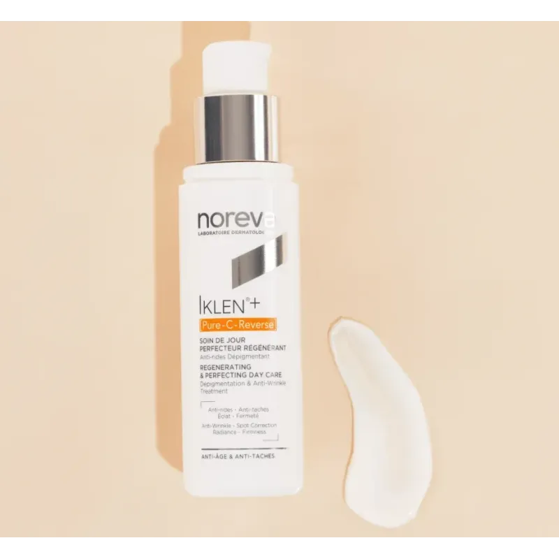Soin de jour NOREVA IKLEN+ PURE-C-REVERSE, anti-âge global 4-en-1, corrige les rides et les taches, redonne éclat et fermeté grâce à la Vitamine C stabilisée et au duo d'Acide Hyaluronique.