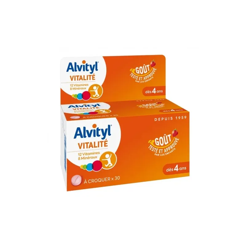 Alvityl Vitalité à croquer est un complément vitaminé et minéral au goût fraise, facile à prendre dès 4 ans, idéal pour lutter contre la fatigue et soutenir l'immunité et la croissance osseuse.