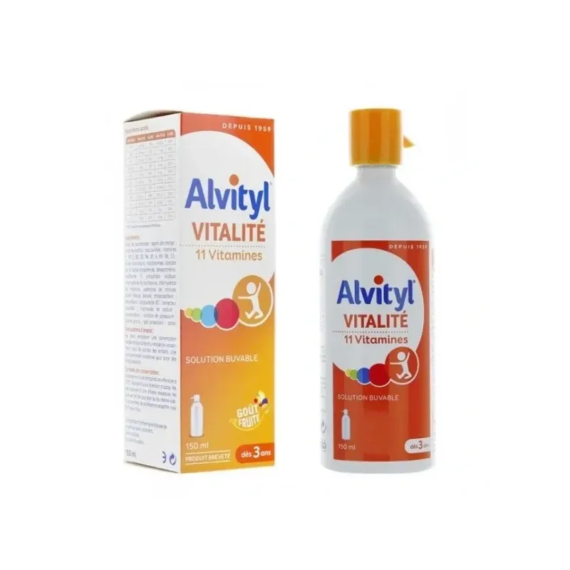 Alvityl Solution Buvable 150 ml est un sirop multivitaminé (11 vitamines) au goût fruité, adapté aux enfants dès 3 ans et aux adultes pour les aider à retrouver forme et vitalité, notamment grâce à la Vitamine D pour la croissance et aux vitamines B et C contre la fatigue.