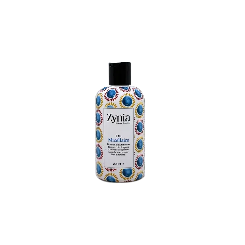 Eau Micellaire Zynia (250 ml), solution 3-en-1 nettoyante et démaquillante sans rinçage, formulée pour éliminer les impuretés du visage, des yeux et des lèvres tout en douceur et en respectant l'équilibre cutané.