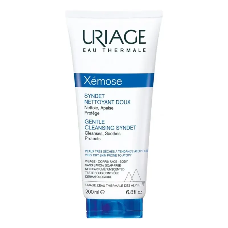 L'URIAGE Xémose Syndet Nettoyant Doux 200ml est un nettoyant visage et corps ultra-doux, sans savon, spécifiquement formulé pour l'hygiène quotidienne des peaux très sèches, sensibles, atopiques (sujettes à l'eczéma) et/ou irritées. Il nettoie en douceur, protège du dessèchement et apaise les inconforts.
