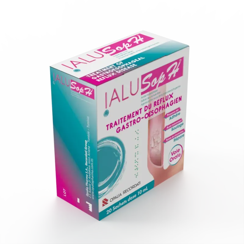 Ialu Sop H (20 sachets de 10 ml), solution buvable à base d'Acide Hyaluronique et de Chondroïtine, elle est utilisée pour former une barrière protectrice mécanique qui soulage immédiatement les symptômes du reflux gastro-œsophagien et aide à réparer la muqueuse œsophagienne.