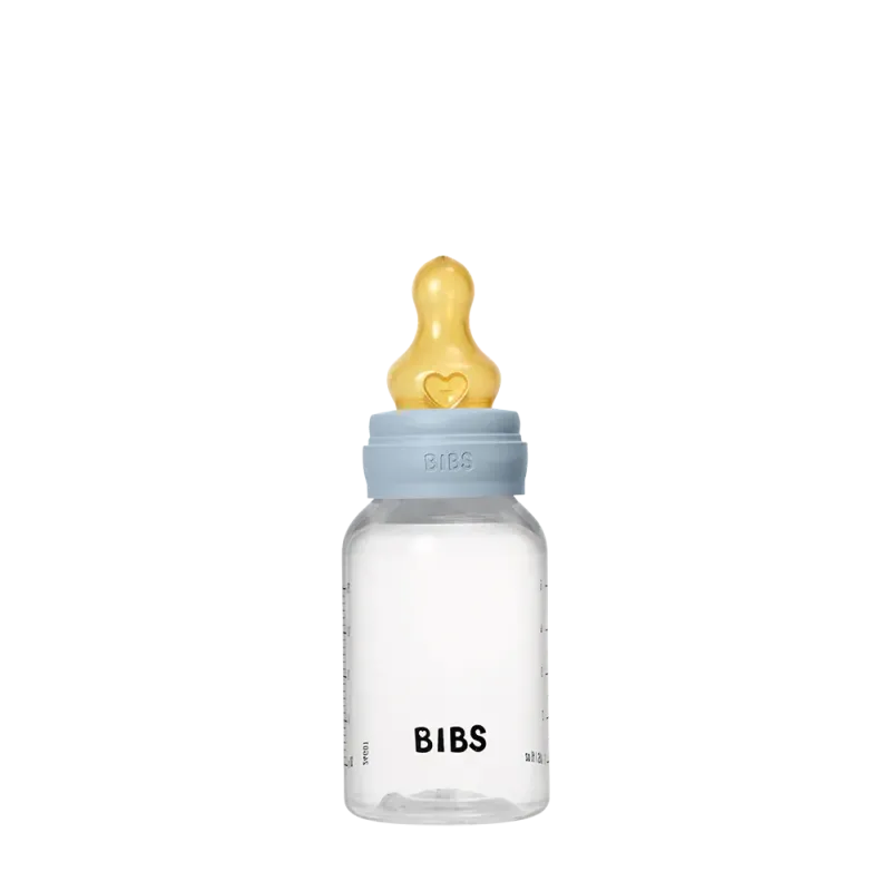 Biberon BIBS, idéal pour nouveau-né, avec tétine en latex ultra-souple, débit lent et système anti-colique, facilitant le passage entre sein et biberon.