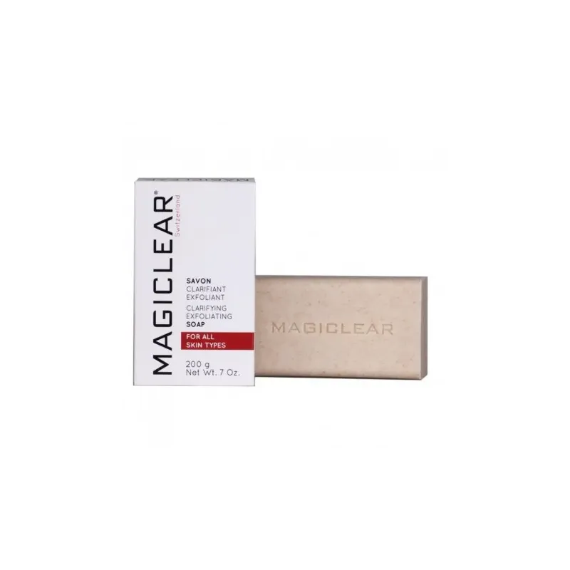 Savon Clarifiant Exfoliant MAGICLEAR 200gr, savon double action qui nettoie et exfolie en douceur le corps et le visage, favorisant le renouvellement cellulaire et l'éclat du teint, en préparation aux soins anti-taches.