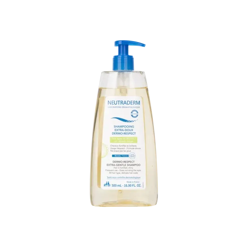 Shampooing Neutraderm Extra Doux Dermo-Respect 500ml, soin capillaire sans silicone qui nettoie très délicatement les cheveux normaux et délicats. Sa formule hypoallergénique respecte le cuir chevelu et convient au lavage fréquent de toute la famille.