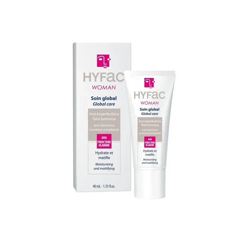 Soin Global HYFAC Woman 40ml, traitement dermatologique multi-actions pour la peau adulte. Il réduit les imperfections et les marques, régule le sébum, et lisse la peau pour un teint mat, uniforme et un éclat retrouvé.