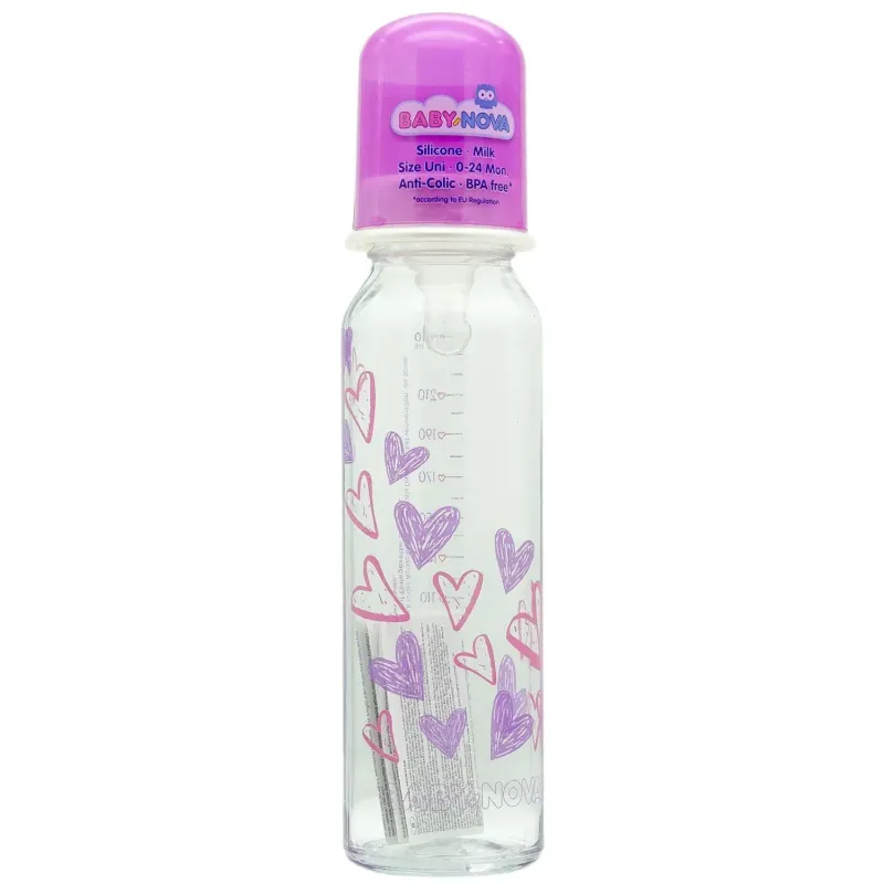 Ce biberon de la marque Baby Nova est conçu pour l'alimentation des nourrissons et des jeunes enfants de 0 à 24 mois. Il offre une capacité plus grande de 240 ml, le rendant idéal pour les repas qui augmentent en volume à mesure que le bébé grandit, ou pour les bébés ayant des besoins plus importants dès la naissance. Son corps est fabriqué en verre de haute qualité, un matériau reconnu pour son hygiène supérieure, sa durabilité, et sa capacité à ne retenir ni odeur ni goût. Le biberon est agrémenté de motifs décoratifs pour le plaisir des yeux. Il est généralement fourni avec une tétine en silicone ou en latex, souvent à débit lent (taille S), appropriée pour les nouveau-nés, mais facilement interchangeable pour s'adapter à la croissance de l'enfant.