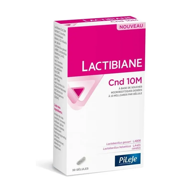 LACTIBIANE CND 10M du Laboratoire PiLeJe est un complément alimentaire probiotique ciblé, présenté en boîte de 30 gélules. Ce produit est spécifiquement formulé pour soutenir l'équilibre du microbiote dans un contexte de déséquilibre des flores digestives et intimes, souvent associé à une prolifération de levures de type Candida albicans (d'où le "CND"). Il contient deux souches microbiotiques spécifiques, dosées à 10 milliards d'Unités Formant Colonies (UFC) par gélule (au minimum). Ces souches ont été sélectionnées pour leur capacité à inhiber l'adhérence et le développement de levures pathogènes et à rééquilibrer les écosystèmes.