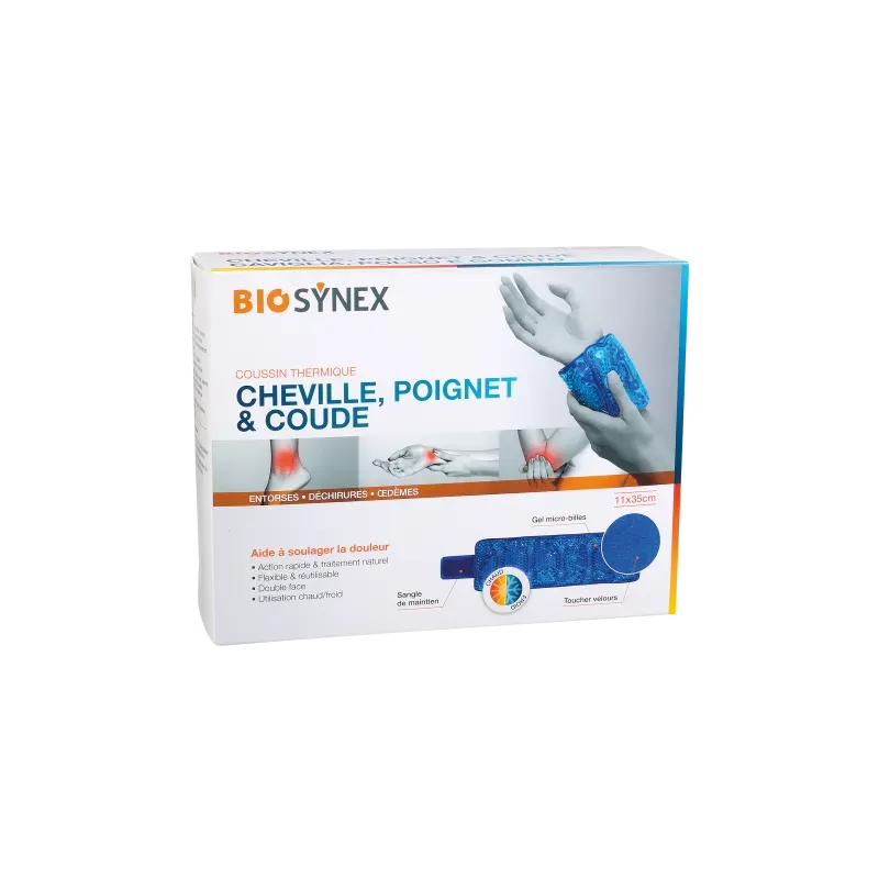 Coussin thermique BIOSYNEX (11x35 cm) réutilisable, spécifiquement adapté à la cheville, offrant une application ciblée de la cryothérapie (froid pour les entorses et inflammations) et de la thermothérapie (chaleur pour les tensions musculaires).