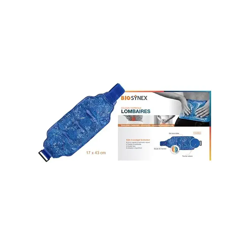 Coussin thermique BIOSYNEX LOMBAIRE (17x43 cm), réutilisable et spécifiquement conçu pour le bas du dos, offrant un soulagement ciblé des douleurs et tensions musculaires grâce à l'application de chaud ou de froid.