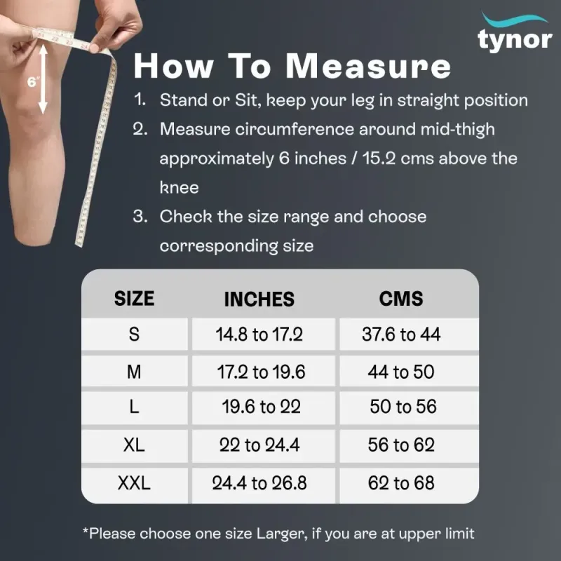 Mesurer la circonférence autour du genou (souvent 15 cm au-dessus du centre de la rotule) pour choisir la taille appropriée (S, M, L, XL).