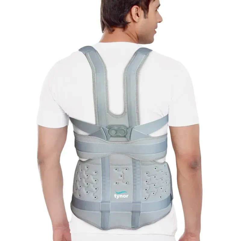 Corset Dorso-Lombaire et Thorax Court TYNOR A34, un support orthopédique rigide conçu pour l'immobilisation des régions lombaire et thoracique inférieure. Il est indispensable pour le traitement des fractures vertébrales stables, les déformations sévères et le maintien post-opératoire du rachis.
