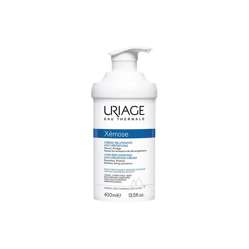 L'URIAGE Xémose Crème Relipidante Anti-Irritations 400ml est un soin émollient riche et protecteur formulé pour le soin quotidien des peaux très sèches à atopiques (sujettes à l'eczéma) et à tendance aux démangeaisons. Son grand format de 400ml avec pompe est idéal pour une utilisation généreuse et économique sur le corps et le visage pour toute la famille. Elle offre une triple action pour apaiser, nourrir intensément et restaurer durablement la barrière cutanée.