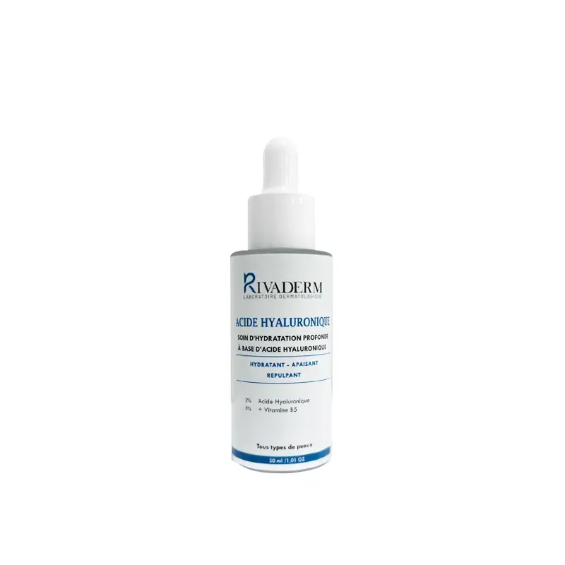 Le RIVADERM SÉRUM ACIDE HYALURONIQUE est un soin hydratant et repulpant intensif formulé à base d'une concentration élevée d'Acide Hyaluronique (HA). Ce sérum utilise souvent différentes tailles moléculaires d'HA pour cibler à la fois les couches superficielles et plus profondes de l'épiderme. L'Acide Hyaluronique est un hydratant naturel capable de retenir jusqu'à 1000 fois son poids en eau, ce qui en fait un ingrédient clé pour hydrater intensément, lisser les ridules de déshydratation et améliorer l'élasticité et la fermeté de la peau. Sa texture légère pénètre rapidement sans laisser de film gras.
