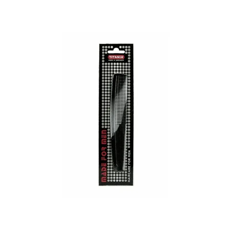 Le Peigne Titania Men 1801/4 est un accessoire de coiffage classique de 17,5 cm, spécialement conçu pour les besoins quotidiens de l'homme. Fabriqué en Allemagne, ce peigne est conçu dans un plastique élastique de haute qualité, offrant à la fois flexibilité et robustesse. Sa particularité réside dans sa configuration "double denture" : il présente un côté avec des dents larges pour un démêlage efficace et sans effort, et un côté avec des dents plus fines pour une mise en forme précise. Les dents sont parfaitement polies et leurs extrémités arrondies pour respecter la fibre capillaire et le cuir chevelu.