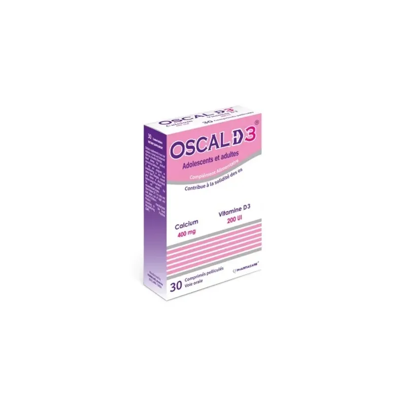 PHARMACARE OSCAL D3 est un complément alimentaire formulé pour renforcer la densité osseuse et soutenir le système immunitaire. Présenté sous forme de comprimés, il combine idéalement le Calcium et la Vitamine D3. Le calcium est le minéral principal entrant dans la composition des os, tandis que la vitamine D3 joue un rôle crucial en permettant l'absorption intestinale du calcium et sa fixation sur la trame osseuse. Cette synergie est fondamentale pour prévenir la fragilité osseuse et maintenir une structure squelettique solide à tous les âges de la vie.