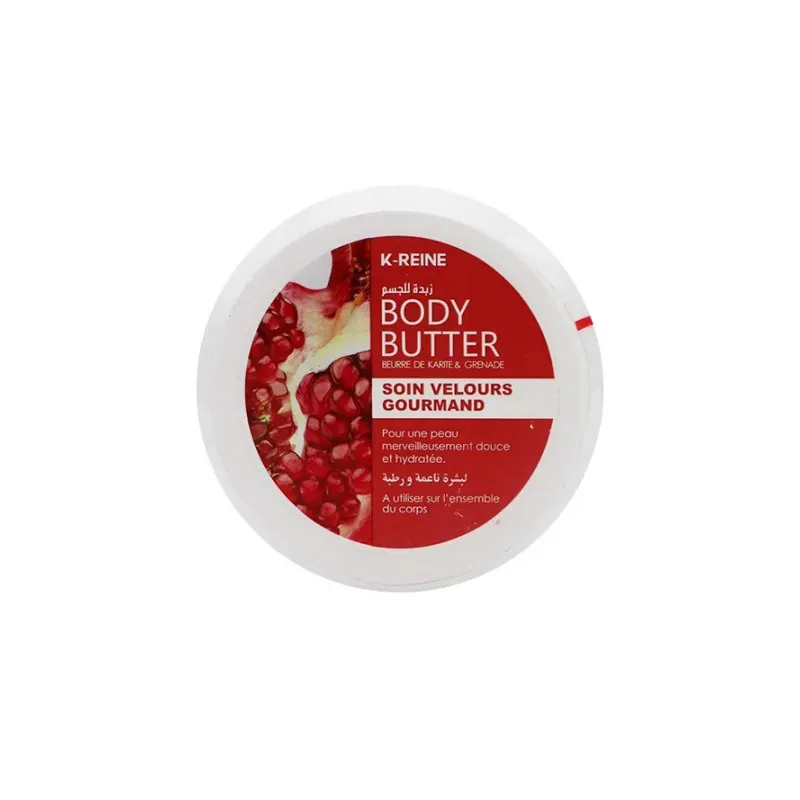 Le Beurre Corporel à la Grenade de K-Reine est un soin corporel ultra-nourrissant conçu pour offrir une hydratation intense et durable. Sa texture onctueuse et fondante pénètre rapidement la peau pour lui redonner souplesse et éclat. Formulé pour lutter contre le dessèchement cutané, il enveloppe le corps d'un parfum fruité et revitalisant de grenade, transformant chaque application en un véritable moment de plaisir sensoriel.