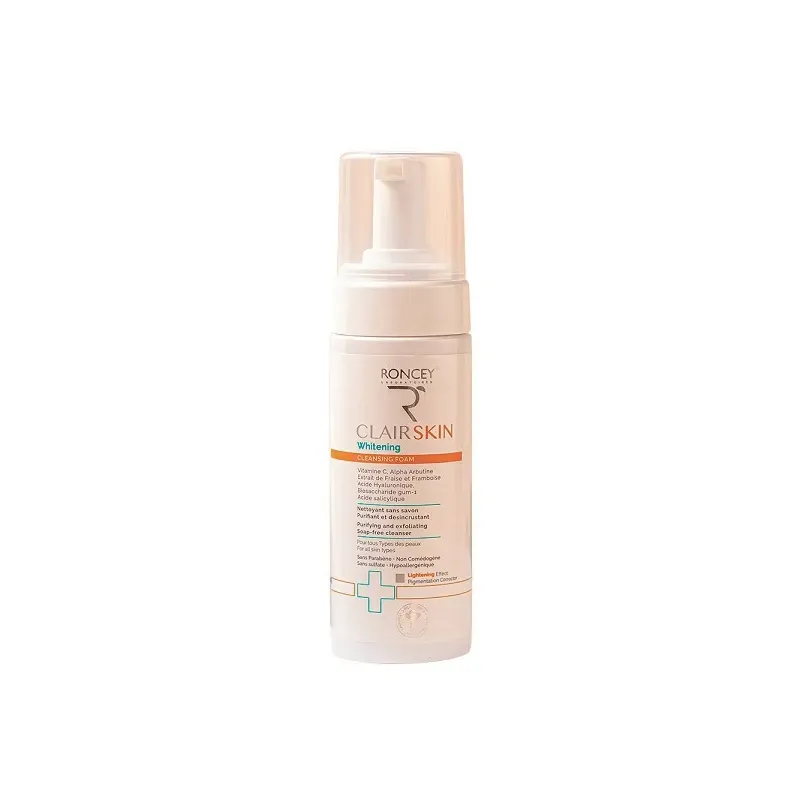 La Mousse Nettoyante Éclaircissante Clairskin de Roncey est un soin quotidien à double action, formulé pour nettoyer la peau en profondeur tout en ciblant les problèmes de pigmentation. Sa texture aérienne et onctueuse permet d'éliminer les impuretés, l'excès de sébum et les résidus de maquillage sans agresser l'épiderme. Elle agit directement sur les mécanismes biologiques responsables de l'hyperpigmentation pour révéler un teint plus clair, frais et parfaitement unifié dès les premières utilisations.